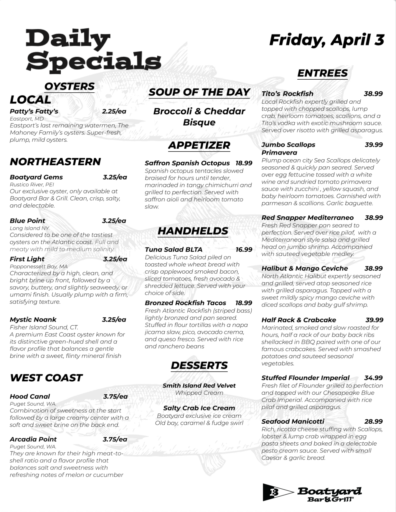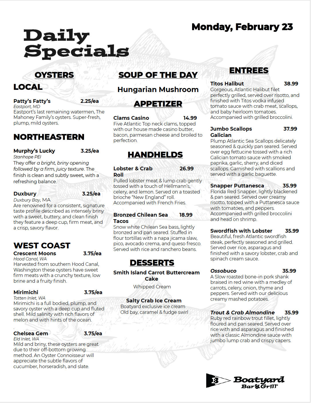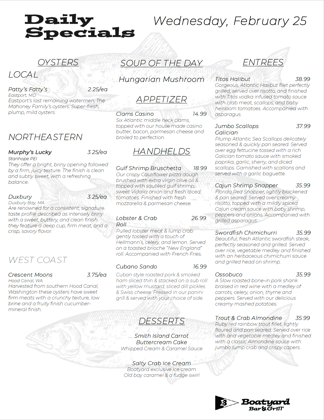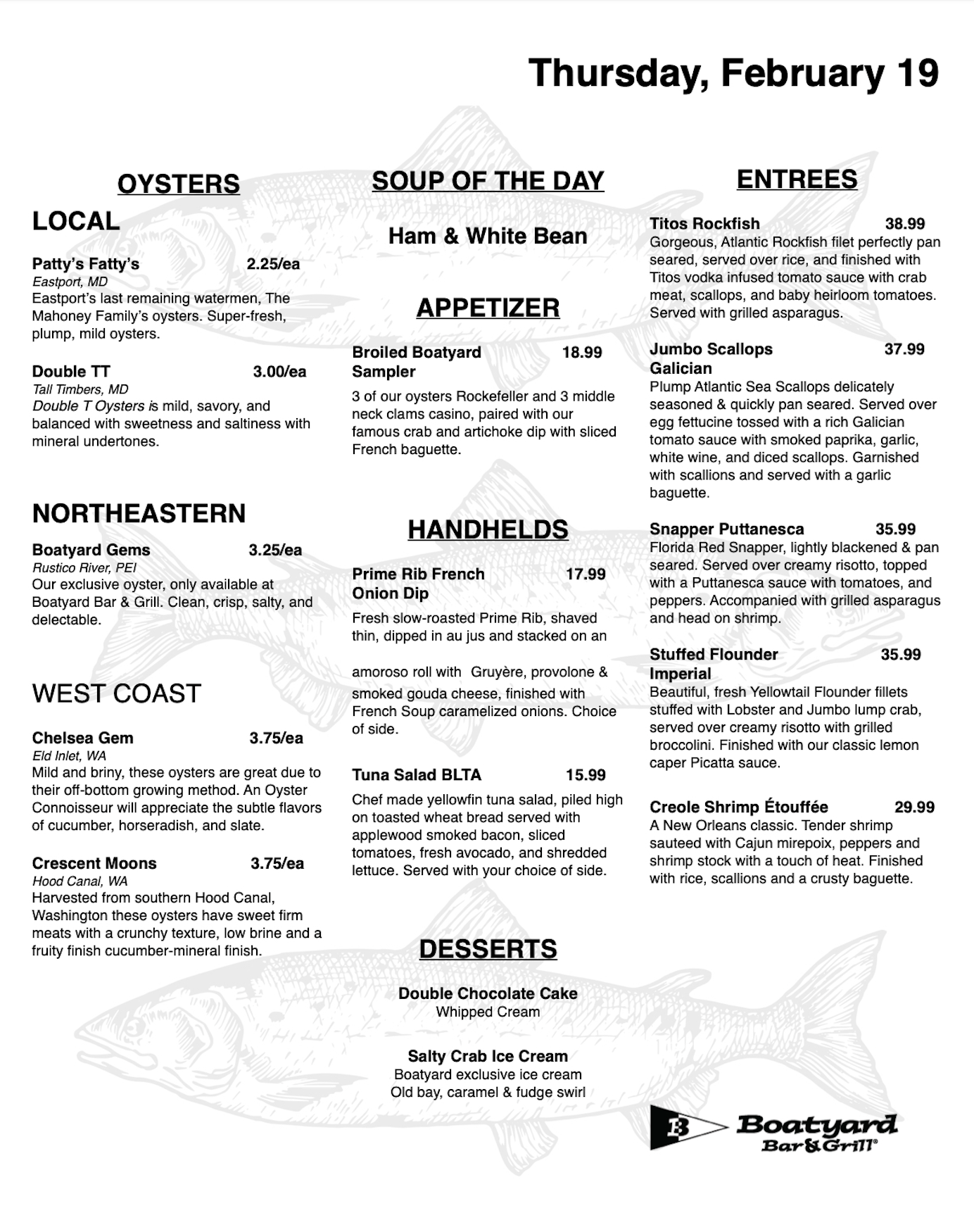 To ensure the best quality of your order, please pick up within the quoted timeframe. During peak hours at the Boatyard, we may elect to suspend Carry-Out orders for a time so that our guests - both at the restaurant and at home - are assured a pleasant, high quality meal.