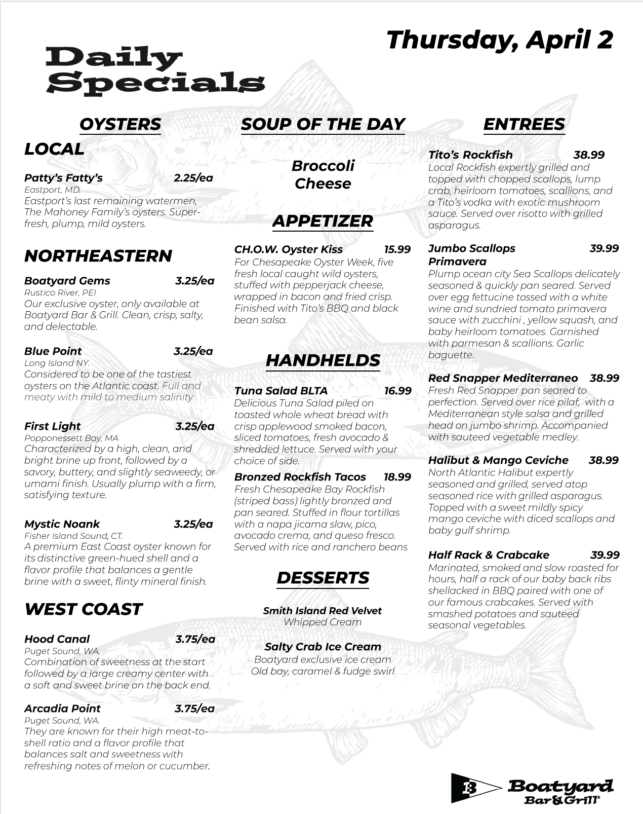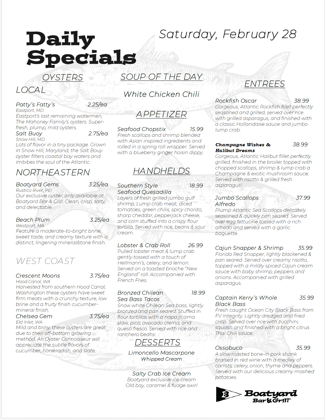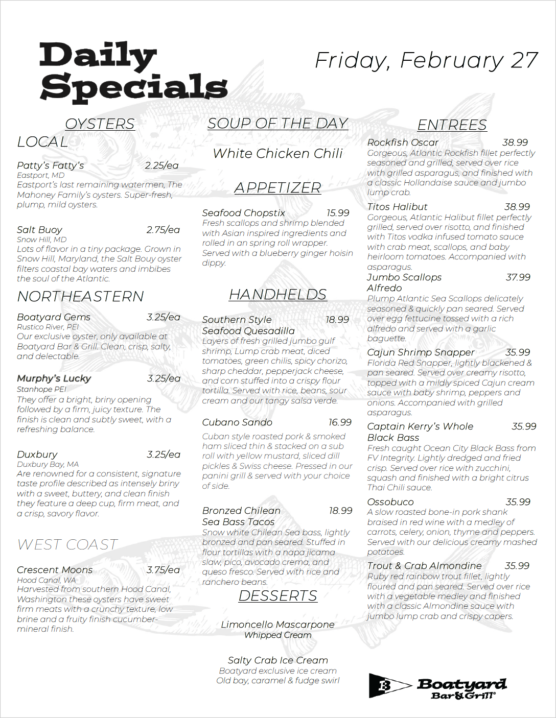 To ensure the best quality of your order, please pick up within the quoted timeframe. During peak hours at the Boatyard, we may elect to suspend Carry-Out orders for a time so that our guests - both at the restaurant and at home - are assured a pleasant, high quality meal.