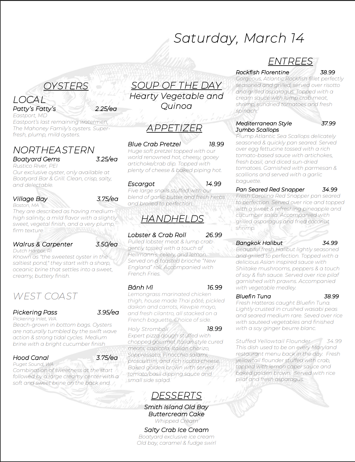 Crab Cakes, Raw Bar, Fish Tacos, Crab Soups, Local Seafood, Lobster Rolls, Burgers, Pint Drinks